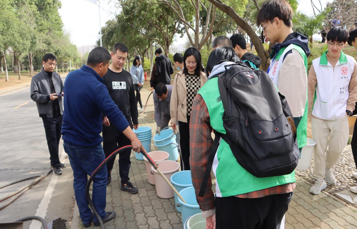 活动第二项,师生一起完成植树活动,大家共同填充土壤,浇定根水。